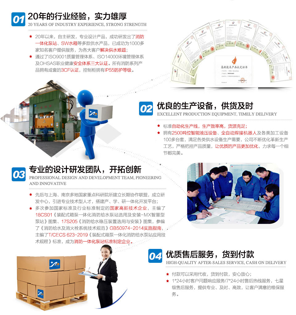我公司以產(chǎn)品為導(dǎo)向與國家重點科研院所建立長期協(xié)作聯(lián)盟,成立了研發(fā)中心并先后開發(fā)了幾十個專利項目,抗浮箱泵一體化成套設(shè)備等多個產(chǎn)品被列為江蘇省高新技術(shù)產(chǎn)品。主編的...